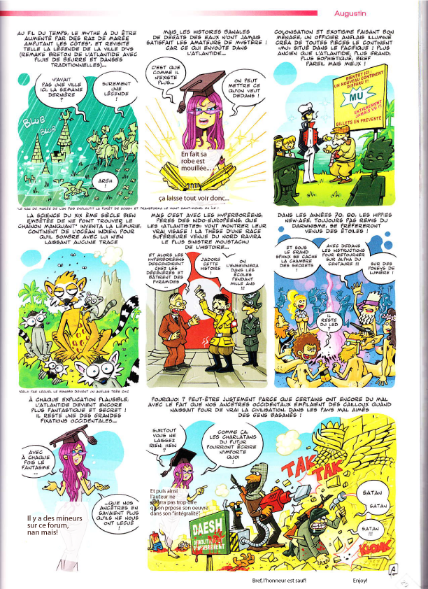 J'avais montré, il y a deux ans, des extraits d'une BD issue des Chroniques d'Augustin dans Lanfeust Mag sont des mises au point sur notre culture en général, l'histoire en particulier, à l'humour tour à tour iconoclaste, grinçant et corrosif. Je met ici l'intégralité de la double page.