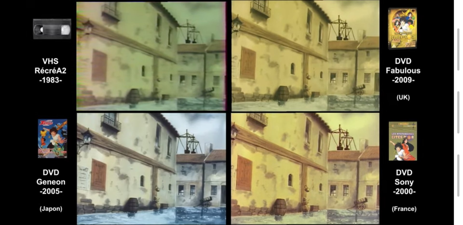 3) Je comprends qu'on peut totalement decoréler le cadrage des aspects techniques - ce n'est pas parce qu'on a des formats différents qu'on aura un cadrage différent. Celui-ci est peut-être dû à l'instabilité de l'image sur les bords. Bien dommage en tout cas. Mais bon j'en déduis que c'est un problème propre à l'édition des Cités d'or, pas aux séries des années 80 d'une manière générale.