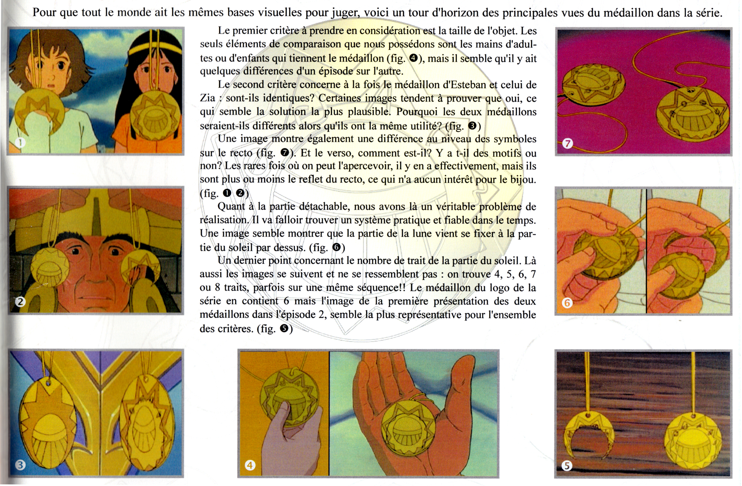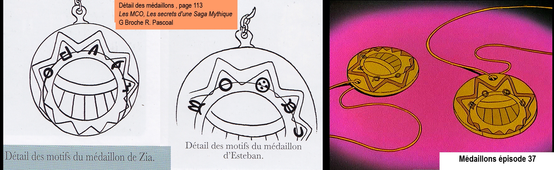 Zia et Esteban comparent leur médaillon. Celui d'Esteban a beau être privé de sa partie centrale, on reconnait sans problème les sigles qui lui sont spécifiques, en particulier les "oreilles de lapin" du premier symbole (en fait ce sont les antennes d'un papillon messager). Je te reposte les scan des images de production. Enfin, pour le reste, je continue de pencher pour la négligence.