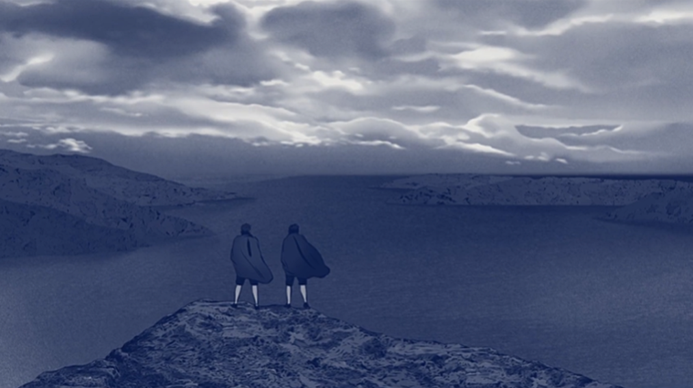 :Mendoza: : Je jetai de nouveau un coup d'œil en direction de mes compagnons. Leur respiration formait toujours des nuages de buée alors qu'une mouette dissimulée par le blanc manteau lança un appel déchirant. Devant leurs yeux, rien que l'immense étendue de mer d'où n'émergeait aucun écueil, car, du haut de la péninsule, on ne pouvait apercevoir à quelques lieues de là, les îlots en contrebas. La lumière faiblissait déjà et les frontières de leur monde blanc s'ourlaient de gris. Je les sentis embarrassés. Mais peut-être en était-il ainsi de tous les moments que l'on savait historiques.