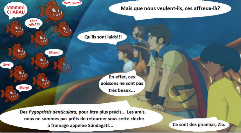 Ainsi notre équipage pensait pouvoir narguer impunément ces malheureux poissons assoiffés de sang, bien à l'abri derrière une cloison de verre. Mais tandis qu'ils devisaient gaiement et comparaient la taille des mâchoires, se riaient des yeux globuleux et avides des petits monstres, derrière eux quelqu'un n'en croyait pas ses propres yeux et sentait la salive lui envahir la bouche, irrésistiblement, son estomac grogner de douleur , ses jambes flageoler tant il était affamé: cela faisait longtemps, bien trop longtemps qu'il n'avait rien eu à se mettre sous la dent....et là, là...à quelques mètres à peine, cette pêche miraculeuse qui lui tendait les nageoires, ces petits poissons dodus d'un rouge appétissant, qui avaient l'air aussi juteux qu'une pomme croquante...il lui fallait planter ses dents dans cette chair qui s'offrait, même crue!