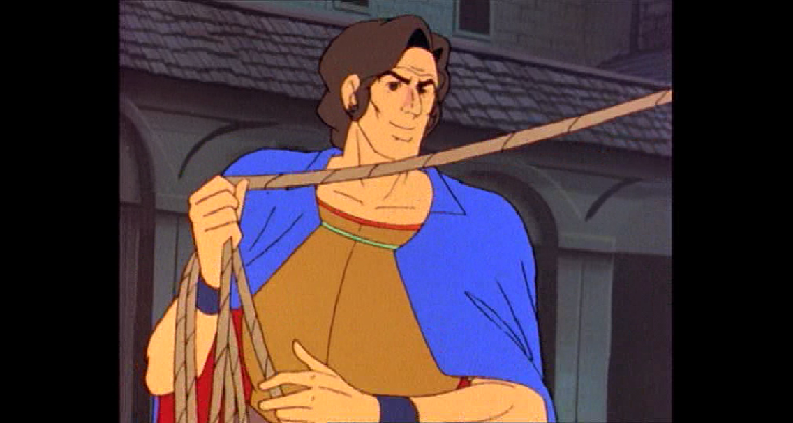 Réduisant la longueur de corde, le marin s'élança dans les airs. À mi-chemin, il prit appui sur le gouvernail et termina sa course sur le pont de dunette.