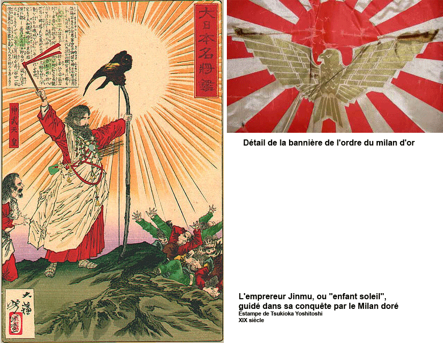 Ce qui rend Jinmu intéressant pour nous, c’est le récit de sa conquête, guidé par un oiseau envoyé des dieux et qui est présenté soit par un corbeau ou surtout comme un Milan doré.