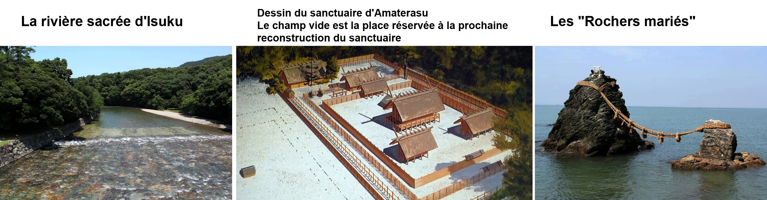 Les descendants de cet empereur ont par la suite fondé le sanctuaire d’Ise, le site shinto le plus ancien et le plus sacré au japon, consacré à Amaterasu et qui abriterait l’un des trois présents dont la déesse aurait gratifié les empereurs et seraient à l’origine de leur domination. Ise, serait conserve ainsi le Yata no Kagami un miroir magique lui permettant de voir toutes les îles du Pacifique. (Le disque en bronze à droite. Oui, il ne ressemble plutôt à un bouclier...)