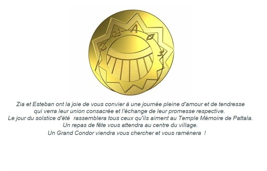 Quand ils approchent de l'édifice, leurs amis forment une haie d'honneur. Des guerriers de l'Ordre du Condor s'y joignent, ainsi que des soldats du Rajah de Pattala, des Chaldis et des protecteurs de Zimbabwe. Le Rajah lui-même y prend place, de même que le Roi Neshangwe, Malik, Nadim, le Cheick Hakim, Tian Li, Long Chow, Petit Tigre, Petit Dragon, Yu Chunhe, Mei Li, Yoshi, Ichiro, Mariko et Li Shuang. Un individu un peu exubérant cherche, quant à lui, où se mettre... C'est Nostradamus ! Au bout d'un moment, le français se glisse finalement entre deux bédouins. Tandis qu'ils avancent, les futurs époux, plein de reconnaissance, adressent aux invités de larges sourires. Aujourd'hui, il n'y a plus d'Elus. Il n'y a plus non plus de porteurs de médaillons, d'atlantes, ni de muens, ni d'aventuriers... Aujourd'hui, il n'y a qu'un jeune homme et une jeune femme prêts à se déclarer leur amour éternel, auprès de leur frère, un père et leurs amis... Dans la cour du Temple Mémoire, vite plein à craquer, les invités s'assoient sur les bancs placés là pour l'occasion ou s'accoudent le long des garde-fous, puis un grand silence s'installe et la cérémonie commence. Esteban et Zia avaient pensé un temps privilégier un mariage dans la plus pure tradition hindoue. A la réflexion cependant, en signe de reconnaissance, d'hommage envers celui qui a élevé Esteban, le Père Rodriguez, ils ont plutôt choisi les rites catholiques. Tour à tour, chaque invité effectue un discours, rappelant ce que les promis lui ont apporté et donnant sa bénédiction à leur union. Athanaos se charge quant à lui des oraisons, d'une voix chevrotante en raison de son émotion, intense, qu'il a beaucoup de mal à contenir...