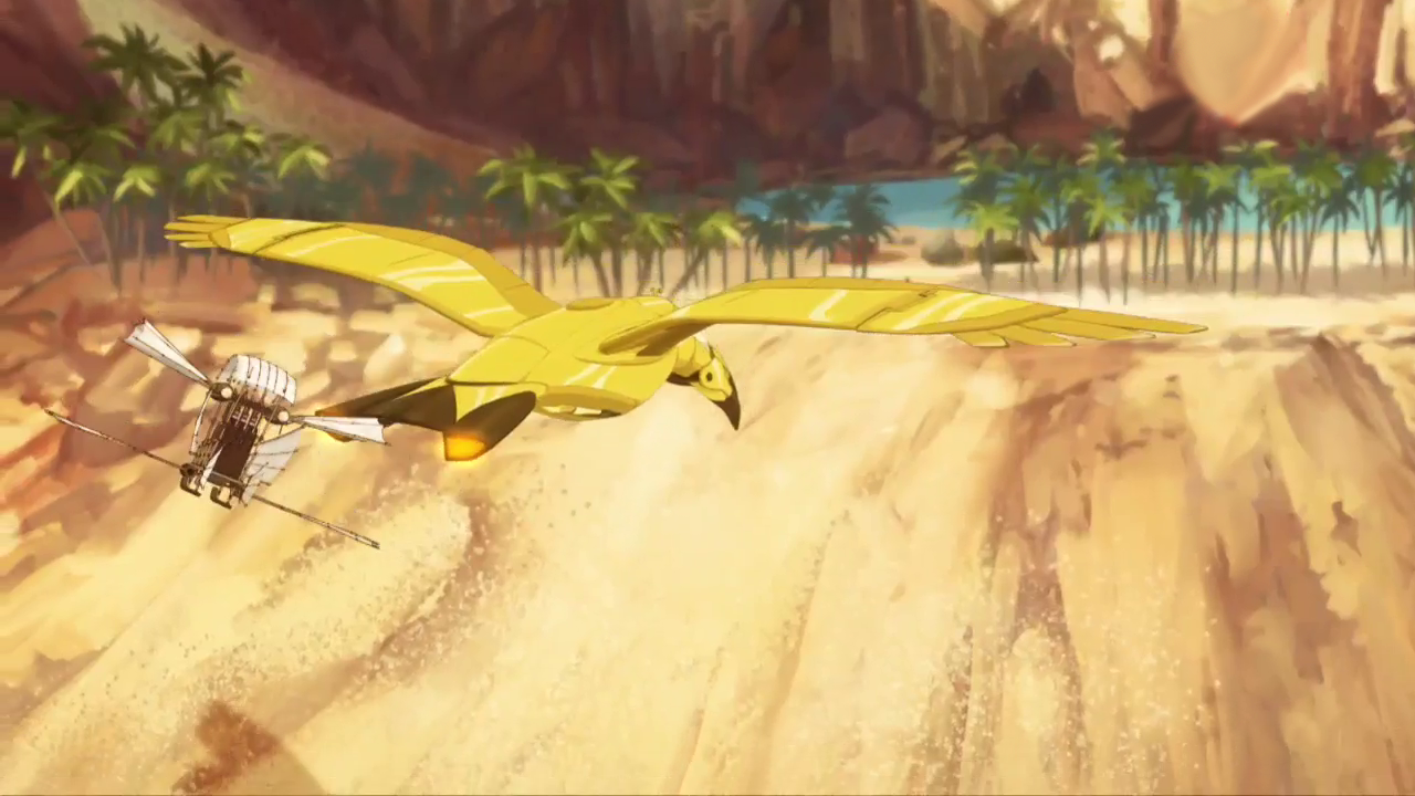 Une heure plus tard, l'oiseau d'orichalque et ses passagers survolaient l'oasis de Manfourah. Peu de temps après ils croisèrent un zephti. Zia crut reconnaître une silhouette qui lui était plus que familière mais avec la distance à laquelle se trouvait l'aile volante, il lui était impossible de savoir qui en était le pilote. Ils arrivèrent en vue du campement.