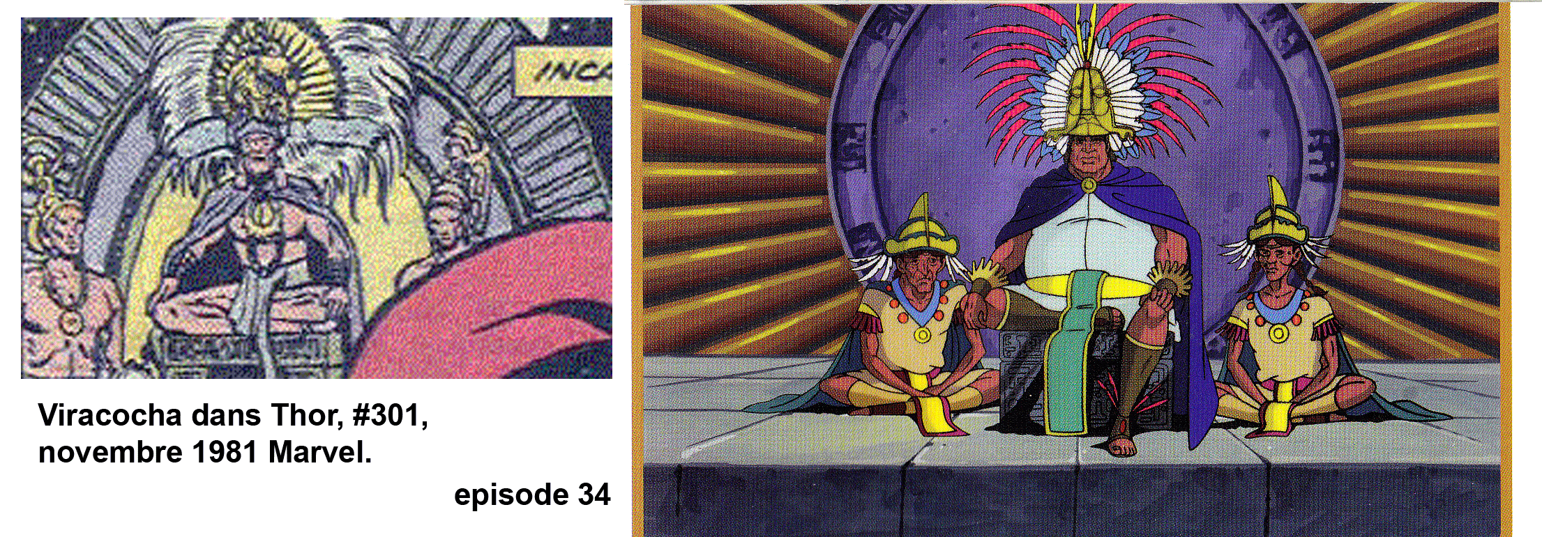 Les animateurs japonais sont des fan de Marvel. Au point même de s'être inspirés de certains comics au moment de la production. Cette scène de Thor leur a tellement plu qu'ils l'ont non seulement réutilisée dans l'épisode 34, mais ils ont aussi recyclé le décor soleil/autel en un autre endroit .