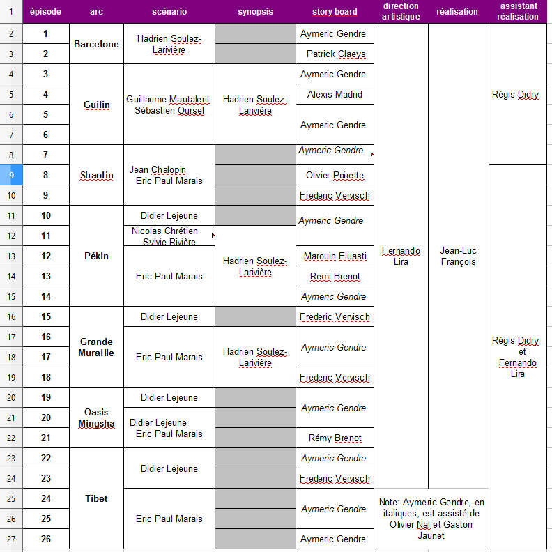 D'après plusieurs articles, c'est Eric-Paul Marais qui est l'auteur de l'arche narrative, scénariste et co-scénariste dans la saison 2 des épisodes 7 (Shaolin) ; 8 (La Trahison) ; 9 (La prophétie) ; 12 (Dans La Cité Interdite) ; 14 (L'évasion) ; 16 (Le Labyrinthe) ; 17 (Le Jardin Endormi) ; 18 (Le Fils du Soleil) ; 20 (La Frasque des Yeux Maudits) ; 21 (La Séparation) ; 24 (Le Nid du Condor) ; 25 (La révélation) ; 26 (Face à face).).