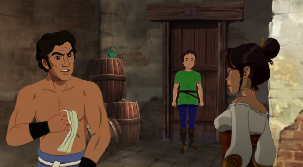 Pablo: À Barcelone, on danse devant la cathédrale. Oncle Philippe a fait mettre en perce plusieurs tonneaux de vin. La taverne de Sancho et Pedro est bondée.