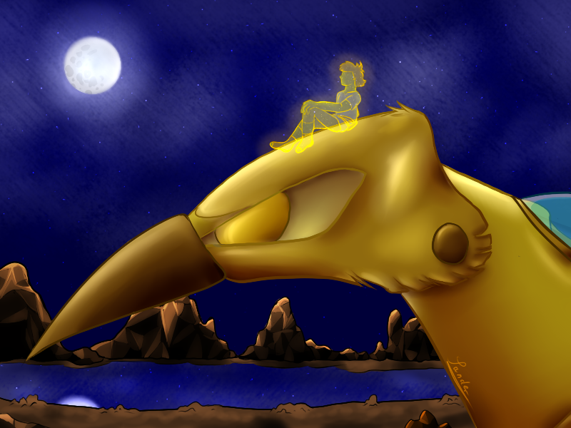 Il n'aimait pas vraiment ça, mais il se disait que ça pouvait toujours être pire. Au moins ses amis étaient avec lui, et ne l'avaient pas abandonné. Il devrait juste vivre avec le fait qu'il était désormais un gigantesque oiseau d'orichalque. Il l'avait accepté, depuis le temps...mais quand même, par moments il s'en sentait bizarre. C'était pas aussi facile à avaler comme changement qu'une nouvelle chemise ou une coupe de cheveux! Bien que personne n'ose ne le lui dire en face, il se doutait bien que les autres trouvaient ça bizarre, plus encore que lui-même. Il n'avait pas à se demander ce qu'ils chuchotaient sur lui derrière son dos métallique.