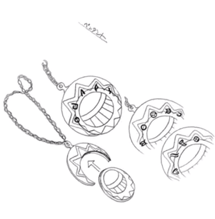 Zia et Esteban comparent leur médaillon. Celui d'Esteban a beau être privé de sa partie centrale, on reconnait sans problème les sigles qui lui sont spécifiques, en particulier les "oreilles de lapin" du premier symbole (en fait ce sont les antennes d'un papillon messager). Je te reposte les scan des images de production. Enfin, pour le reste, je continue de pencher pour la négligence.