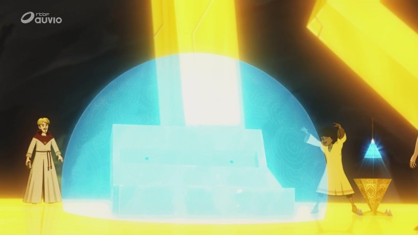 Ah et on a un court bout de remplissage, avec Nostradamus qu’il n’arrive pas à utiliser la couronne (c’est bien de rappeler que ce n’est pas si facile), et Tao qui vole grâce à l’hologramme solide de la pyramide…