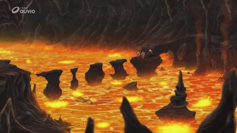 Ils arrivent à une corniche, et là il y a un grand courant d’air. Et heureusement que la lave s’est arrêter de monter pile au bon moment^^ (c’est un chipotage évidement)