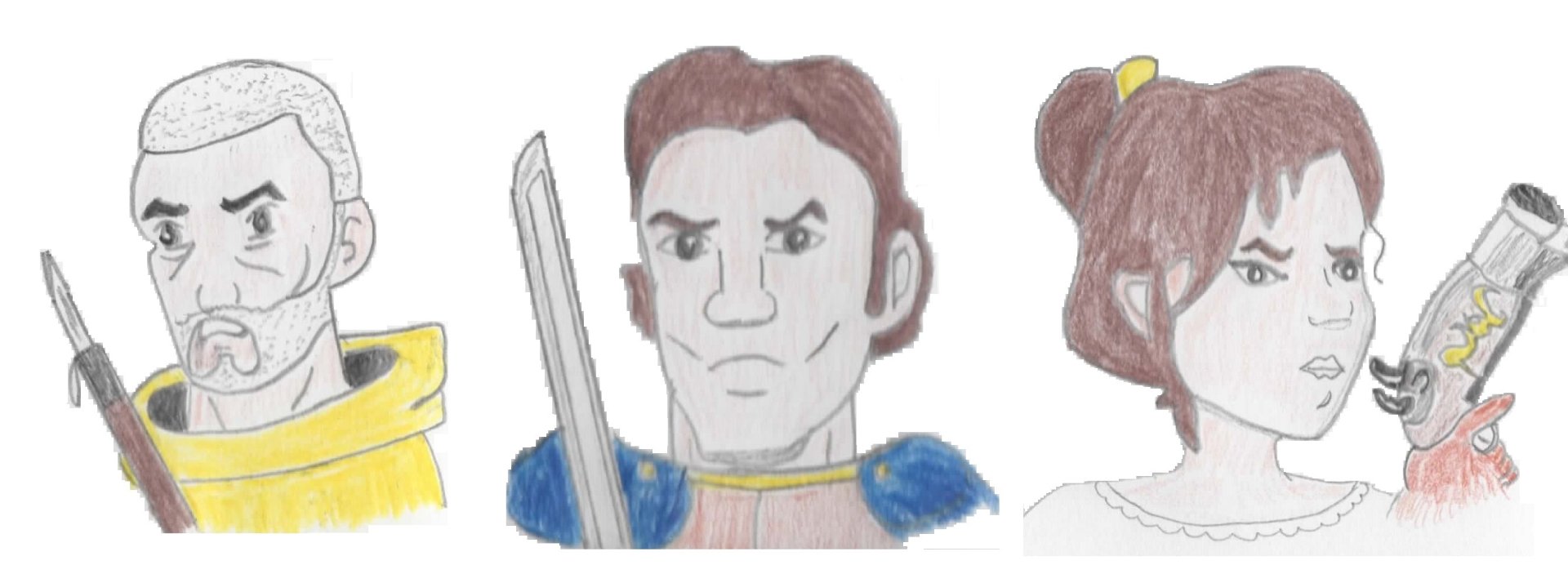 Ses autres compagnons, heureusement, avaient eux aussi déjà leurs armes en main, Athanaos tenant sa lance et Mendoza son épée.  Le trio se tient prêt à l'assault...
