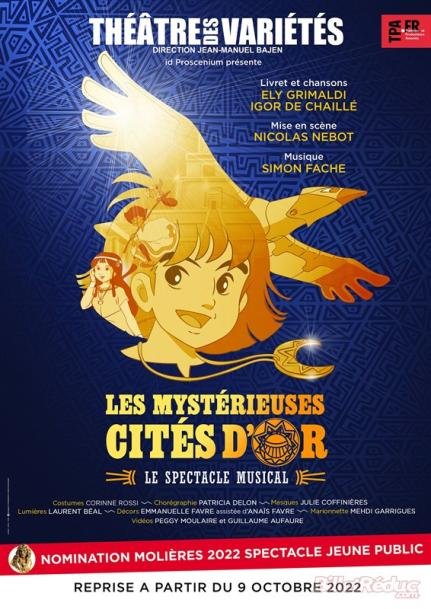 Le spectacle musical "Les Mystérieuses Cités d'Or" Vient de tirer sa révérence au Théâtre des Variétés et fut un véritable succès. Vous pouvez les soutenir et voter pour les Trophées de la Comédie Musicale 2022 dans la catégorie "Trophée du Public" via ce formulaire (nom/prénom/courriel uniquement, c'est très rapide !) en choisissant évidemment "Les Mystérieuses Cités d'Or". Merci et bravo à toute l'équipe !