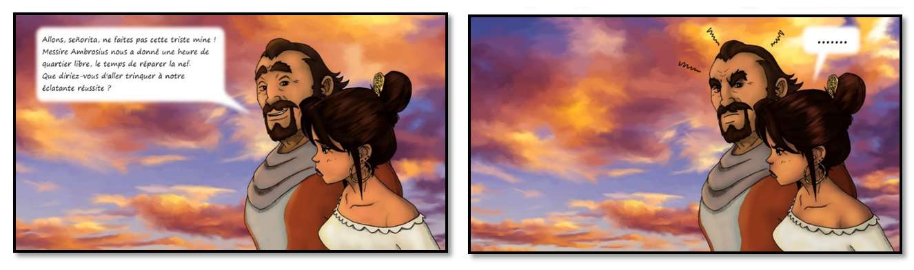 Si j'osais juste une petite remarque et tu vas probablement me détester (car je sais que tu n'aimes pas trop les dessiner), mais j'aurais souhaité voir un peu plus de décors que le ciel en arrière-plan.![]()