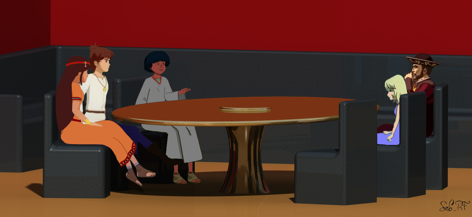 Charles Quint, sa fille et deux gardes se présentèrent derrière le condor ; Esteban ouvrit le haillon arrière pour les laisser monter, et les conduisit à la grande salle, au centre de laquelle se trouvait une grande table ovale en orichalque autour de laquelle le trio et ses invités prirent place, tandis que les gardes restaient postés à l’entrée, sur ordre de l’empereur. Le luxe des aménagements du condor avait fait grande impression sur les hôtes d’Esteban, qui ne purent réprimer un mouvement de surprise en pénétrant à l’intérieur, et ne cessaient de regarder autour d’eux, éblouis. Zia et Tao s’étaient assis de part et d’autre d’Esteban qui faisait face à Charles Quint et à sa fille. Zia serra fort la main de son fiancé, elle n’était à l’évidence pas si à l’aise qu’elle l’avait prétendu, et ses retrouvailles inattendues avec Marie la troublaient.