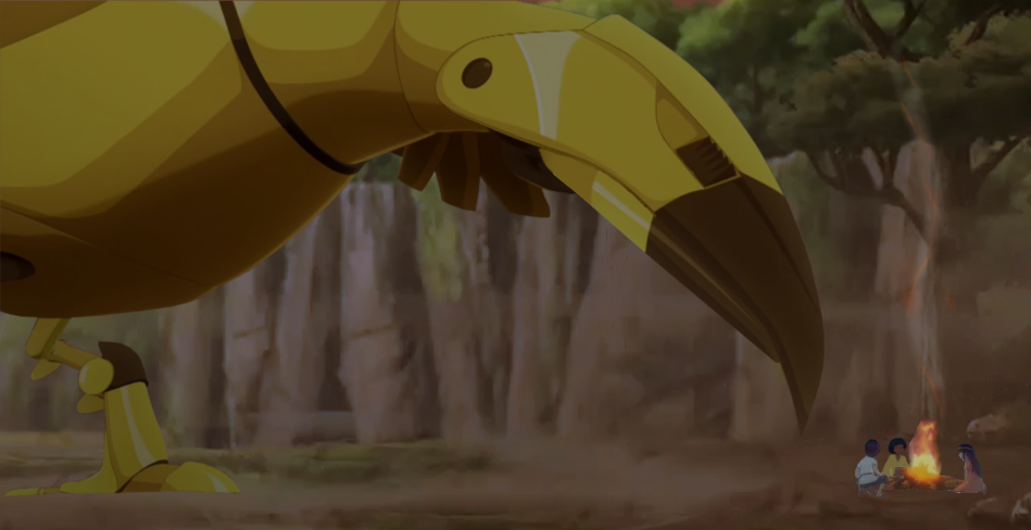 Tao se leva en prenant appui sur sa jambe puis se dirigea vers le bec de l'oiseau et sauta dessus pour commencer à l'escalader sous le regard de ses amis.