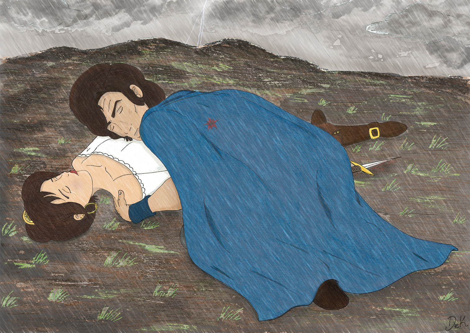 Petit retour en arrière : «La cape les recouvrit. Mendoza, à genoux, avait posé sa tête sur la poitrine de sa bien-aimée. Une étoile sanglante brillait sur l’azur de l’étoffe.»