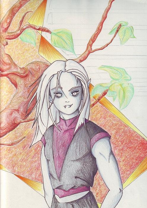 J'étais au cours à l'école et comme d'hab je gribouillais un perso ( que tu vois ici en dessous ). Tu ne seras peut-être pas de mon avis, mais ce jour-là, par je ne sais quelle "magie" j'ai trouvé que j'étais parvenue à mettre "une vraie" vie, une profondeur dans le regard du perso ( je m'y suis réessayée plusieurs fois après sans jamais plus y réussir d'ailleurs... grrrr... )...