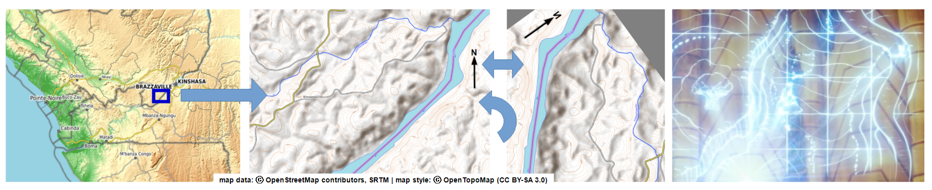 En cherchant un tronçon du fleuve Congo assez rectiligne, peu large, avec un affluent ayant un angle adapté, j'ai trouvé la confluence entre le Congo et le Loufoulakari , 50 km au sud-ouest de Kinshasa / Brazzaville. Celle-ci ressemble fortement à celle de la lumino-projection à condition de retourner la carte dans la direction est-ouest et en échangeant la largeur des rivières (puisque c'est le Congo dont il faut franchir les gorges pour accéder à Orunigi).