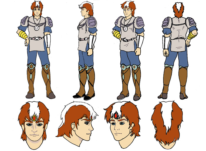 Pour aujourd'hui, c'est une model sheet de Jayce, par Vasco, sur wheelies.net, que je vous poste. Jayce fait à peu près 1,m 80, et a les cheveux châtains et argentés, ainsi que les yeux bleus clairs. Il est le fils unique d'Audric. On ignore ce qui est arrivé à sa mère, car il est clair que Gillian a fait son éducation, comme il avait fait celle de son père précédemment. Jayce est tout vraisemblablement dans sa vingtaine, et fait preuve d'une certaine impulsivité au début de l'histoire, qui disparaît progressivement au fil du temps et de ses expériences. En revanche, il peut être cassant, le plus souvent pour exterioser sa souffrance plus qu'autre chose, la plupart du temps quand Herc veut lui tenir tête pour sauver sa peau. S'il y a bien une chose que Jayce n'apprécie pas, c'est bien qu'on ne pense qu'à soi au détriment des autres, quitte à les faire souffrir en conséquence. D'où ce ton cassant qui peut être mal interprété au premier abord, surtout si vous ne prenez absolument pas le temps de bien le connaître. Jayce a un côté très courageux, voire casse-cou, qui n'est pas sans rappeler celui de Seiya de Pégase, qui lui aussi, n'hésite pas à prendre des risques pour atteindre le but qu'il s'est fixé. Ce qui est certain, c'est que Jayce était fait pour être chef: d'un naturel posé, réfléchi, altruiste, il sait prendre les bonnes décisions, même si elles paraissent complètement folles pour Herc. Son degré d'intelligence correspond à son degré d'élévation morale, il a le sens des valeurs et des principes. Il peut parfois être en proie au doute, ne pas assez se faire confiance, alors qu'il s'en sort pas si mal que ça. Il possède aussi une très grande sensibilité et fragilité affective vis-à-vis de la gente féminine, ce qui peut être un bien, comme un mal: si Herc n'était pas venu à son secours sur la planète Baz, il aurait certainement cédé aux avances d'Ina qui voulait le garder avec elle, d'où qu'il avait préféré partir; avec Kiandra, c'était plus l'écho d'une rencontre faite dans une vie passée, et on sentait que l'estime entre eux était partagée, mais Jayce lui a fait comprendre que sa place était avec son peuple, à présent; enfin, avec Serena, il a tout de suite été attiré par elle, sans prêter attention à ce qu'on racontait ou montrait alentours, ce qui n'est pas forcément la meilleure chose à faire, car on risque de passer à côté d'autre chose entre-temps...en cela, Jayce reste très humain, avec ses qualités et ses failles, qu'il corrige au fil du temps, comme nous le faisons tous.