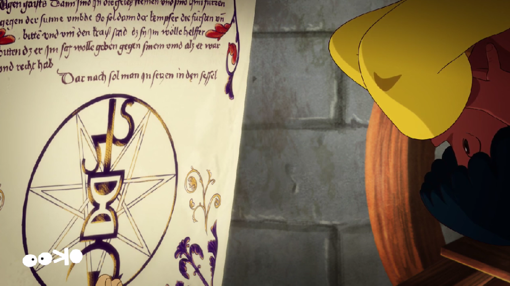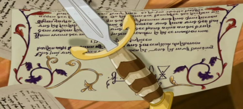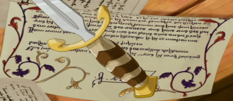 Concernant les papiers éparpillés par Isabella dans la nef, on retrouve le même style de décoration végétale que pour l'acte de création de l'Ordre du sablier.