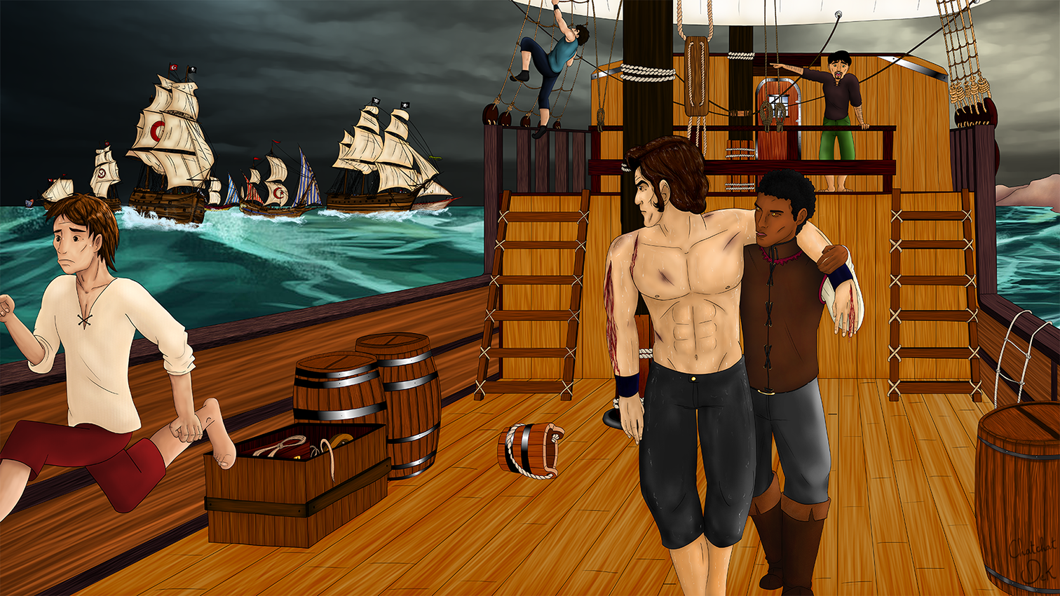 T : C’était donc ça ! Je me disais aussi, j’étais sûr d’avoir percé sa coque la deuxième fois, elle devait être sacrément ralentie, elle ne pouvait naviguer qu’à vitesse réduite sous peine de couler. Et elle savait qu’elle ne ferait pas le poids face aux canons de la galère. Elle s’est donc laissée rattraper pour mieux s’échapper…Mais ça ne m’explique pas comment elle avait pu reprendre autant de vitesse après mon premier coup…